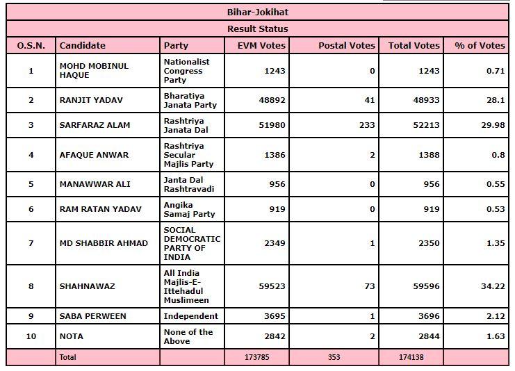 बिहार विधानसभा की सभी 243 सीटों पर मतगणना देर रात खत्म हुई. आरजेडी के सरफारज आलम को AIMIM के शाहनवाज ने 7383 मतों से पटखनी दी. इस सीट पर तीसरे स्थान पर बीजेपी के रंजीत यादव रहे. यहां तीसरे चरण के तहत 7 नवंबर को 55.12% वोटिंग हुई थी. जोकीहाट से 9 उम्मीदवार मैदान में थे.