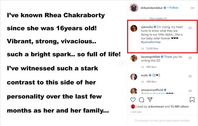 शिबानी की इस पोस्ट पर रिया को कई हस्तियों जैसे विशाल डडलानी, विजय वर्मा, लौरें गोटलिब, रसिका दुग्गल, हर्षवर्धन कपूर संग अन्य ने कमेंट कर अपना सपोर्ट दिया. ऐसे में शिबानी की बहन अनुषा दांडेकर ने भी कमेंट कर लिखा, 'मैं रो रही हूं, मेरा दिल यह जानकर दुख रहा है कि वह हमारी दोस्त के साथ क्या कर रहे हैं. वो हमेशा हमारी छोटी बहन रहेगी.'
