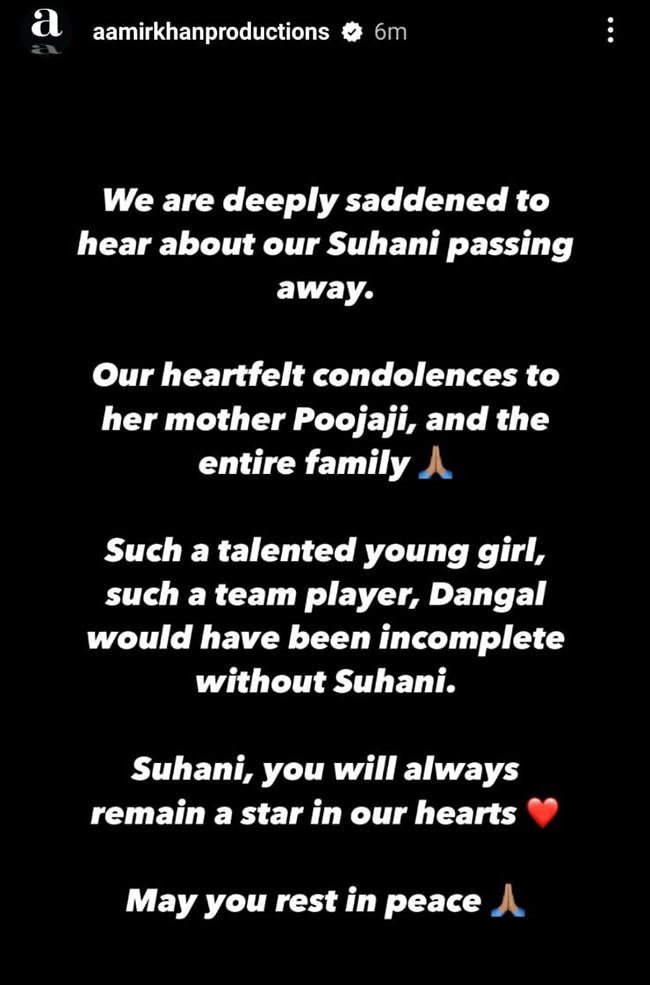 सुहानी भटनागर के निधन पर आमिर खान प्रोडक्शन की तरफ से एक इंस्टाग्राम पोस्ट शेयर किया गया है. पोस्ट में उन्होंने एक्टिंग के लिए सुहानी को स्टार बताया गया है. ये भी कहा गया कि एक्ट्रेस की मौत से प्रोडक्शन हाउस को झटका लगा है. वो उनके लिए स्टार थीं और हमेशा रहेंगी.