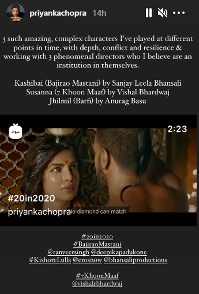 प्रियंका ने इंस्टाग्राम स्टोरी पर अपनी फिल्म और अपने कैरेक्टर्स के नाम बताए हैं. ये वो कैरेक्टर्स हैं जो कि खुद एक्ट्रेस के मुताबिक बहुत शानदार और कॉम्प्लेक्स किरदार थे. उन्होंने इनका नाम मेंशन करते हुए लिखा- 3 शानदार और कॉम्प्लेक्स कैरेक्टर्स जिसे मैंने पूरी शिद्दत, संघर्ष और लचीलेपन के साथ निभाया है, तीन ऐसे बेहतरीन डायरेक्टर्स के साथ जिनके लिए मेरा मानना है कि वे खुद में एक संस्थान हैं. संजय लीला भंसाली की काशीबाई (बाजीराव मस्तानी), विशाल भारद्वाज की सुसन्ना (7 खून माफ) और अनुराग बसु की झिलमिल (बर्फी).