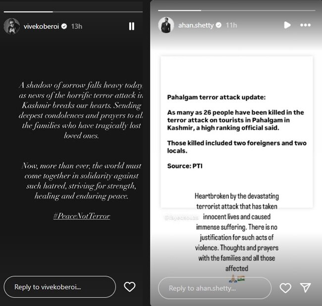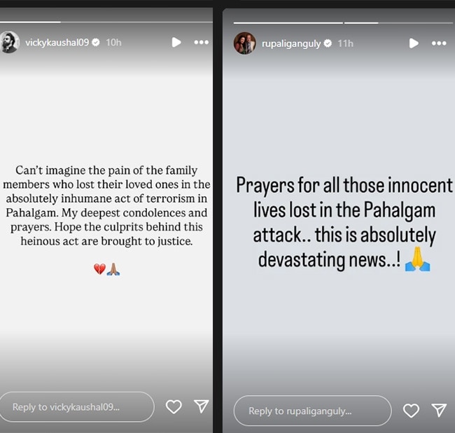 समय और मुनव्वर के अलावा सोनू सूद, विक्की कौशल, रूपाली गांगुली, आसिम रियाज, विजय देवरकोंडा, विवेक ओबेरॉय और शिल्पा शेट्टी ने भी पहलगाम में हुए हमले को लेकर सोशल मीडिया पर पोस्ट शेयर की हैं. विजय देवरकोंडा ने लिखा, 'मैं दो साल पहले पहलगाम में अपना जन्मदिन मनाया था. शूटिंग और हंसी-मजाक के बीच मेरे एक लोकल कश्मीरी दोस्त ने हमारा बहुत अच्छा ख्याल रखा था. जो कल हुआ वो बहुत दिल तोड़ने वाला और गुस्सा दिलाने वाला है. खुद को फोर्स बताकर टूरिस्ट का कत्ल करना शर्मनाक बात है और कायरता है.'
