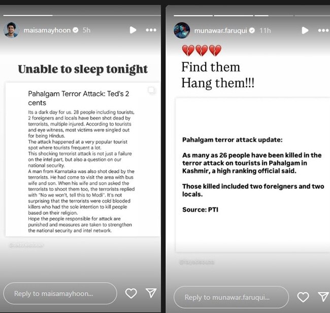 पहलगाम में हुए हादसे पर आम जनता के साथ-साथ बॉलीवुड, टीवी और सोशल मीडिया स्टार्स का भी रिएक्शन सामने आ रहा है. कॉमेडियन समय रैना ने इस खबर को अपनी इंस्टा स्टोरी पर शेयर कर लिया कि वो सो नहीं पा रहे हैं. तो वहीं मुनव्वर फारूकी ने आतंकियों को पकड़कर उन्हें फांसी देने की मांग उठाई है.