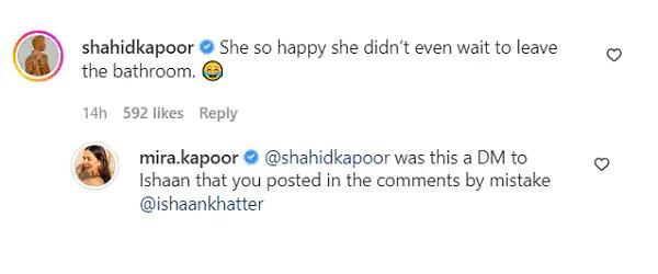 शाहिद के इस कमेंट पर मीरा भी पीछे नहीं हटीं. मीरा ने भी कमेंट कर शाहिद को ट्रोल करने की पूरी कोशिश की. मीरा ने लिखा - 'क्या ये मैसेज ईशान के लिए था, जो तुमने गलती से कमेंट में लिख दिया.' फैंस को शाहिद- मीरा का कमेंट सेक्शन में ये स्पैट मजेदार लगा. लोगों ने खुद भी कमेंट कर पति पत्नी के ह्यूमर की जमकर तारीफ की और जोक्स भी बनाए. एक यूजर ने लिखा - '12 साल के बच्चे जैसे वाइब्स' तो वहीं एक दूसरे यूजर ने लिखा- 'आप दोनों बहुत क्यूट हैं, जैसे मैं और मेरे पति'. साथ ही फैंस को मीरा का ये लुक बहुत पसंद आ रहा है. कई यूजर्स ने कमेंट कर मीरा की जमकर तारीफ की है.