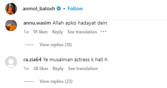 एक यूजर ने एक्ट्रेस को ट्रोल करते हुए लिखा- आपको अल्लाह हिदायत दे. एक दूसरे यूजर ने लिखा- ये मुसलमान एक्ट्रेस का हाल है. एक अन्य यूजर ने अनमोल का मजाक उड़ाते हुए लिखा- अपना पायजामा पहन लो, सर्दी हो रही है, ठंड लग जाएगी. कई यूजर्स एक्ट्रेस को इस्लाम याद दिला रहे हैं और बता रहे हैं कि मुसलमान होकर ऐसे कपड़े पहनना ठीक नहीं है.