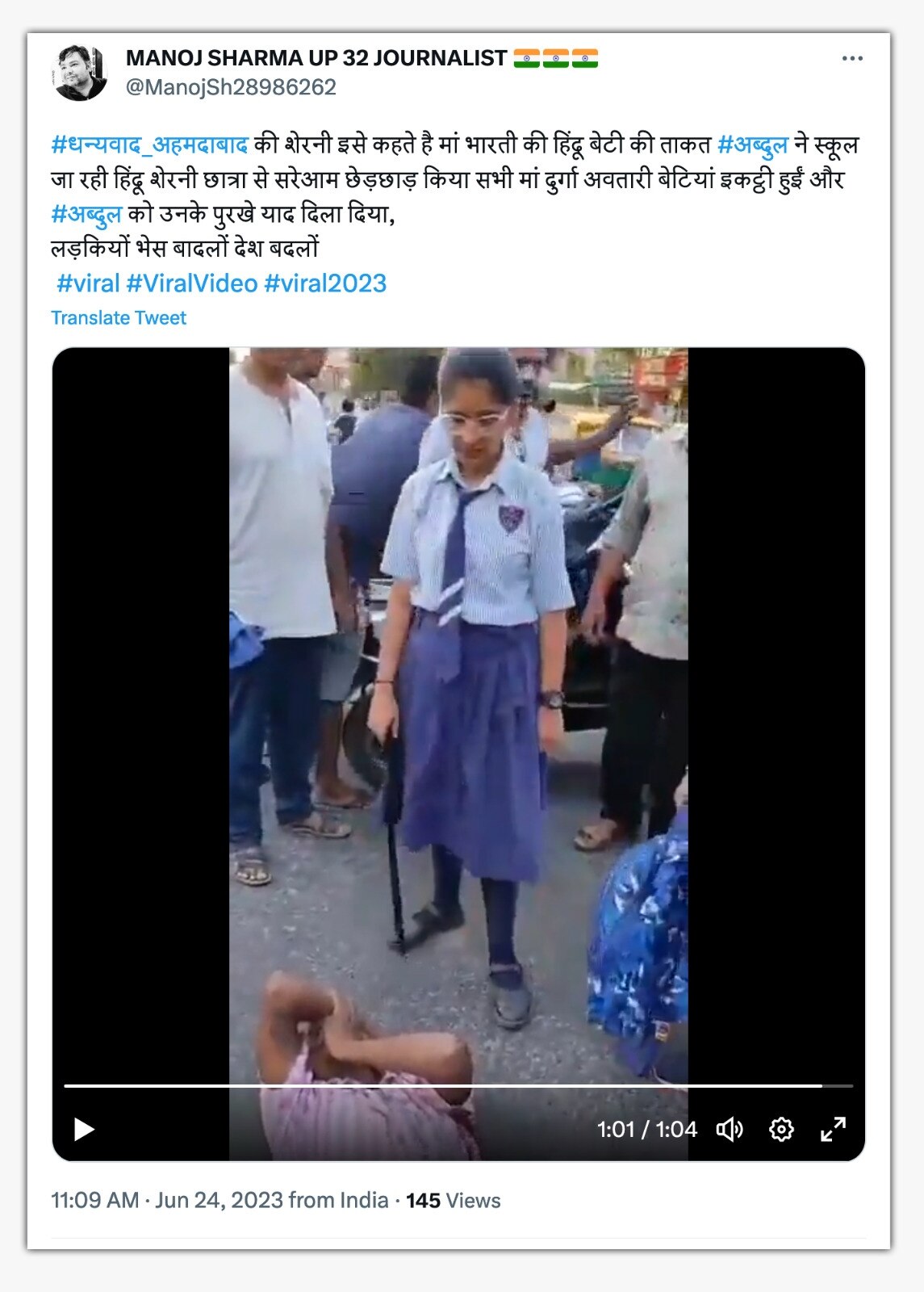 एक व्यक्ति ने वायरल वीडियो को ट्विटर पर शेयर करते हुए लिखा, "धन्यवाद अहमदाबाद की शेरनी इसे कहते है मां भारती की हिंदू बेटी की ताकत. अब्दुल ने स्कूल जा रही हिंदू शेरनी छात्रा से सरेआम छेड़छाड़ किया. सभी मां दुर्गा अवतारी बेटियां इकट्ठी हुईं और अब्दुल को उनके पुरखे याद दिला दिया. अब हमारी बहने जागरूक हो रही हैं."