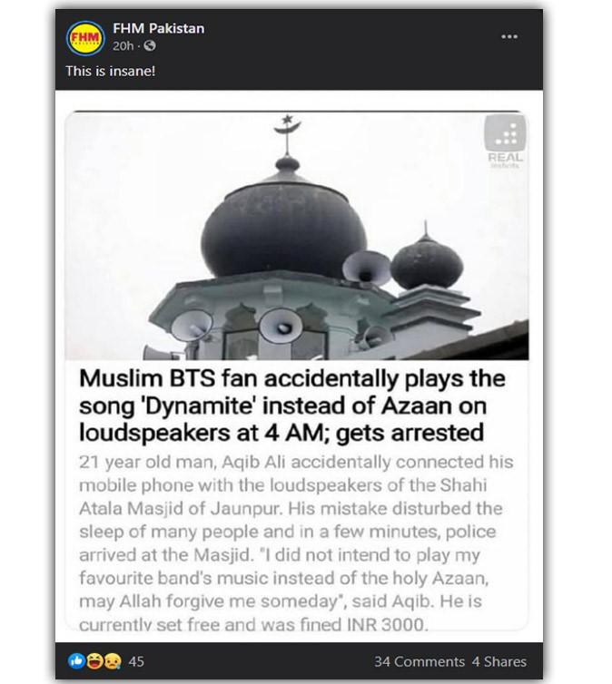 यूपी के जौनपुर में रहने वाले एक कथित कोरियन पॉप के दीवाने की एक खबर सोशल मीडिया पर आग की तरफ फैल चुकी है. इस खबर के वायरल स्क्रीनशॉट में लिखा है कि 21 वर्षीय आकिब अली नाम के शख्स का मोबाइल फोन तड़के चार बजे गलती से जौनपुर की शाही अटाला मस्जिद के लाउडस्पीकर से कनेक्ट हो गया. इस कारण लाउडस्पीकर से अजान की जगह कोरियन पॉप बैंड बीटीएस का गाना ‘डायनमाइट’ बज गया. इसके लिए पुलिस ने आकिब को गिरफ्तार कर लिया, पर बाद में तीन हजार रुपये का जुर्माना लगाकर उसे रिहा कर दिया गया.