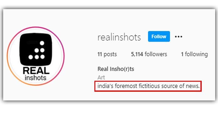 वायरल खबर के स्क्रीनशॉट में एक लोगो के साथ ‘रीयल इनशॉट्स’ लिखा हुआ है. सर्च करने पर हमें इसी नाम का एक इंस्टाग्राम पेज मिला. इस पेज के ‘बायो सेक्शन’में साफ लिखा है कि ये भारत का सबसे मशहूर काल्पनिक खबरों का स्रोत है.
