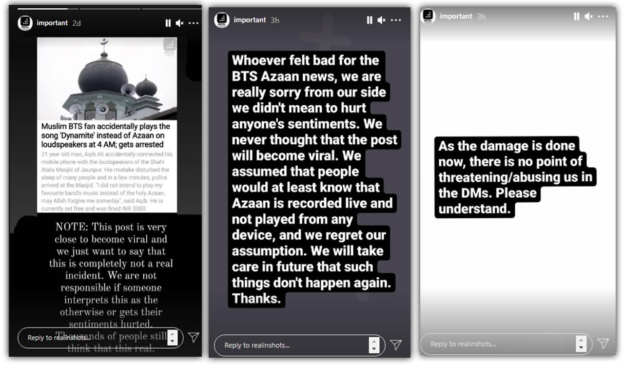 जौनपुर की मस्जिद वाली खबर अब ‘रीयल इनशॉट्स’ के पेज से डिलीट हो चुकी है. इस पेज को चलाने वालों ने ‘इंस्टाग्राम स्टोरी’के जरिये बाकायदा इस बात की पुष्टि की कि मस्जिद में कोरियन पॉप गाना बजने जैसी कोई घटना जौनपुर में नहीं हुई है. स्टोरी में ये भी लिखा है, “अगर किसी को इस खबर की वजह से बुरा लगा तो हम माफी चााहते हैं. हमारा मकसद किसी को ठेस पहुंचाना नहीं था. हमें लगा था कि लोग इस बात से वाकिफ होंगे कि अजान लाइव रिकॉर्ड होती है, किसी मोबाइल या डिवाइस से कनेक्ट करके नहीं बजाई जाती. पर ये हमारी भूल थी.”