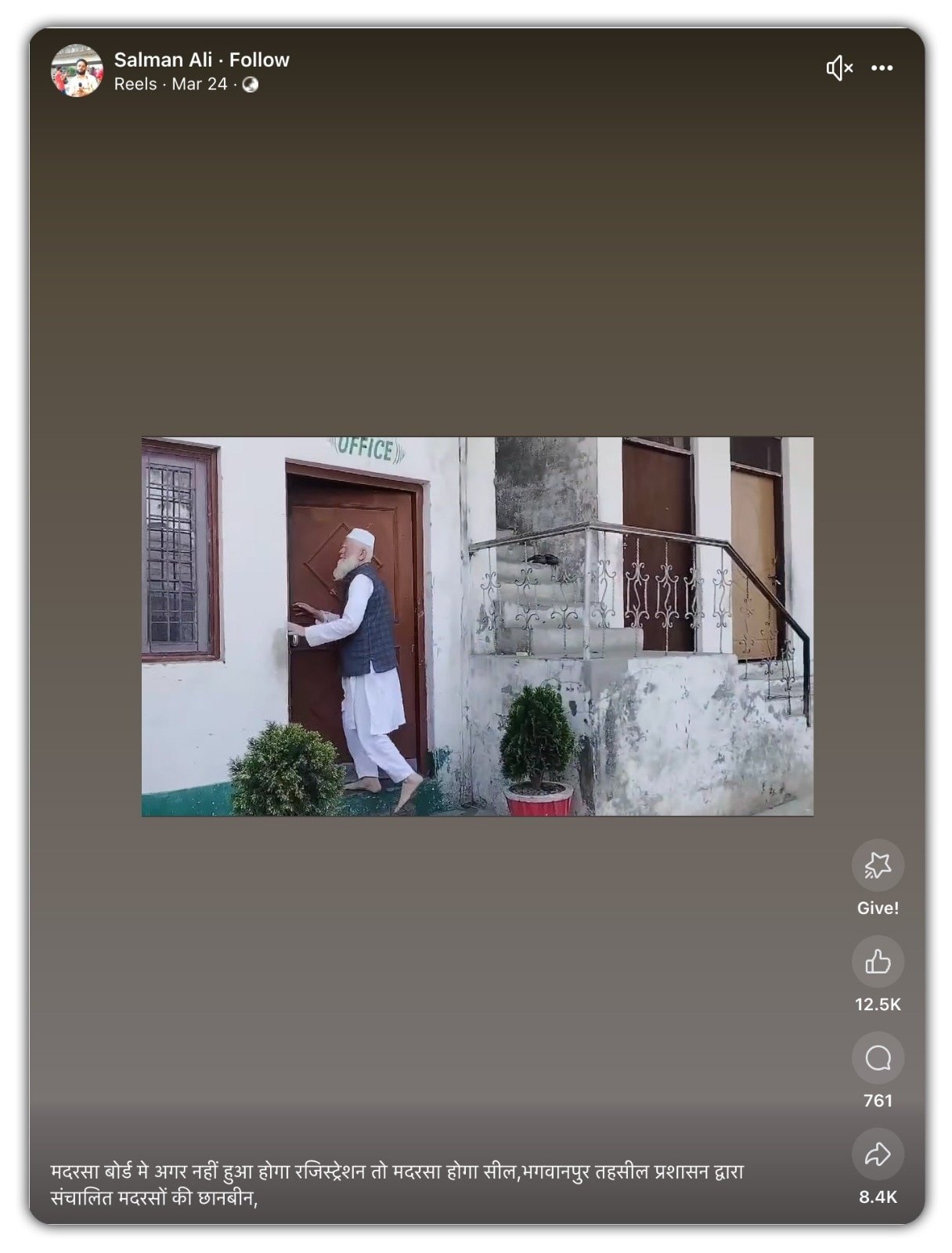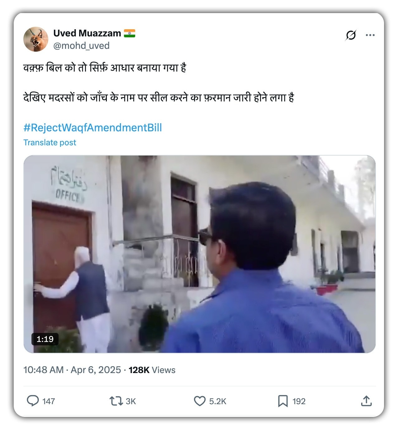 वीडियो के साथ लोग लिख रहे हैं कि “यूपी में मदरसों पर कार्रवाई शुरू हो चुकी है जिन लोगों को लग रहा था कि Waqf बिल से कुछ नहीं होगा उनके लिए यह वीडियो सबक है”. वक्फ कानून से जोड़ते हुए वीडियो को फेसबुक और एक्स पर कई यूजर्स शेयर कर चुके हैं.