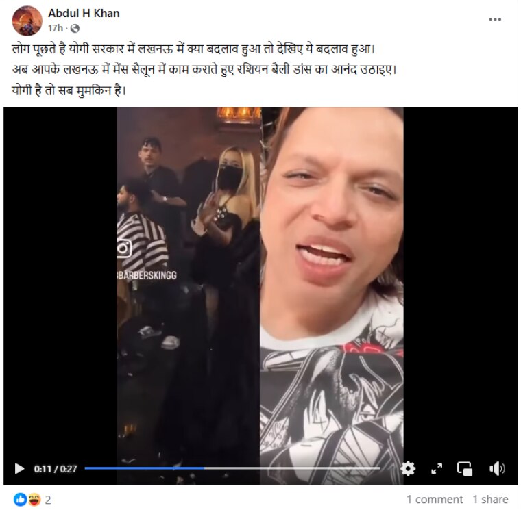 कुछ सोशल मीडिया यूजर्स इस वीडियो को शेयर करते हुए उत्तर प्रदेश के मुख्यमंत्री योगी आदित्यनाथ पर तंज कस रहे हैं. मिसाल के तौर पर, एक व्यक्ति ने लिखा, “लोग पूछते है योगी सरकार में लखनऊ में क्या बदलाव हुआ तो देखिए ये बदलाव हुआ. अब आपके लखनऊ में मेंस सैलून में काम कराते हुए रशियन बैली डांस का आनंद उठाइए. योगी है तो सब मुमकिन है.”