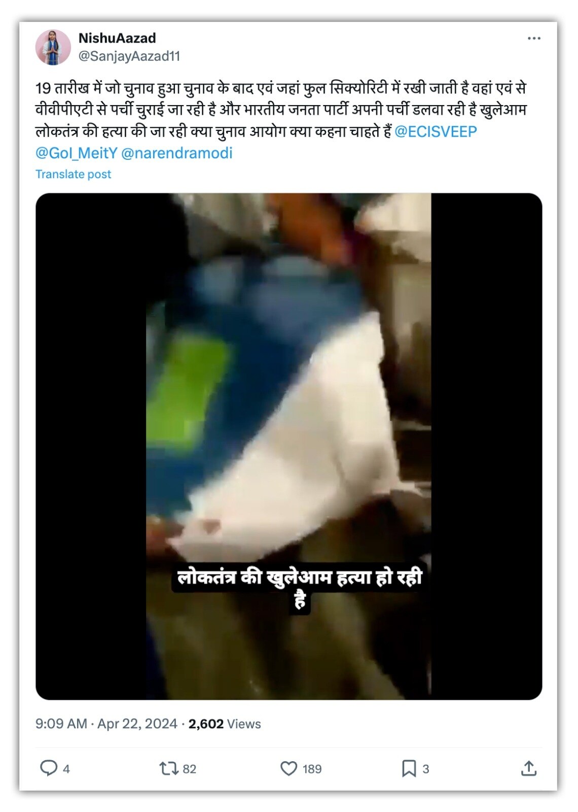 इस वीडियो को शेयर कर एक एक्स यूजर ने लिखा, “19 तारीख में जो चुनाव हुआ चुनाव के बाद एवं जहां फुल सिक्योरिटी में रखी जाती है वहां एवं से वीवीपीएटी से पर्ची चुराई जा रही है और भारतीय जनता पार्टी अपनी पर्ची डलवा रही है खुलेआम लोकतंत्र की हत्या की जा रही क्या चुनाव आयोग क्या कहना चाहते हैं.” पोस्ट के आर्काइव्ड वर्जन को यहां देखा जा सकता है.