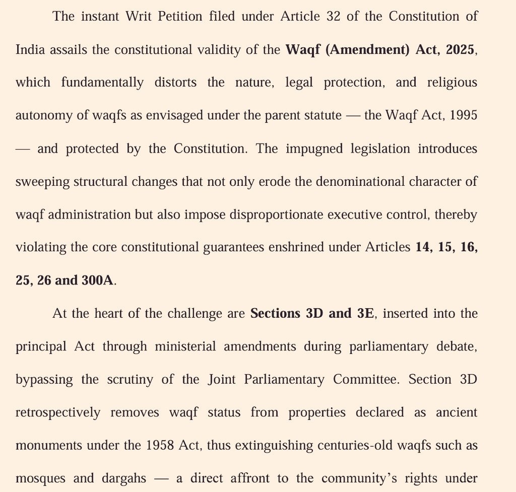 याचिका के मुताबिक, भारतीय संविधान के अनुच्छेद 32 के तहत दायर की गई यह रिट याचिका वक्फ (संशोधन) अधिनियम, 2025 की संवैधानिक वैधता को चुनौती देती है.