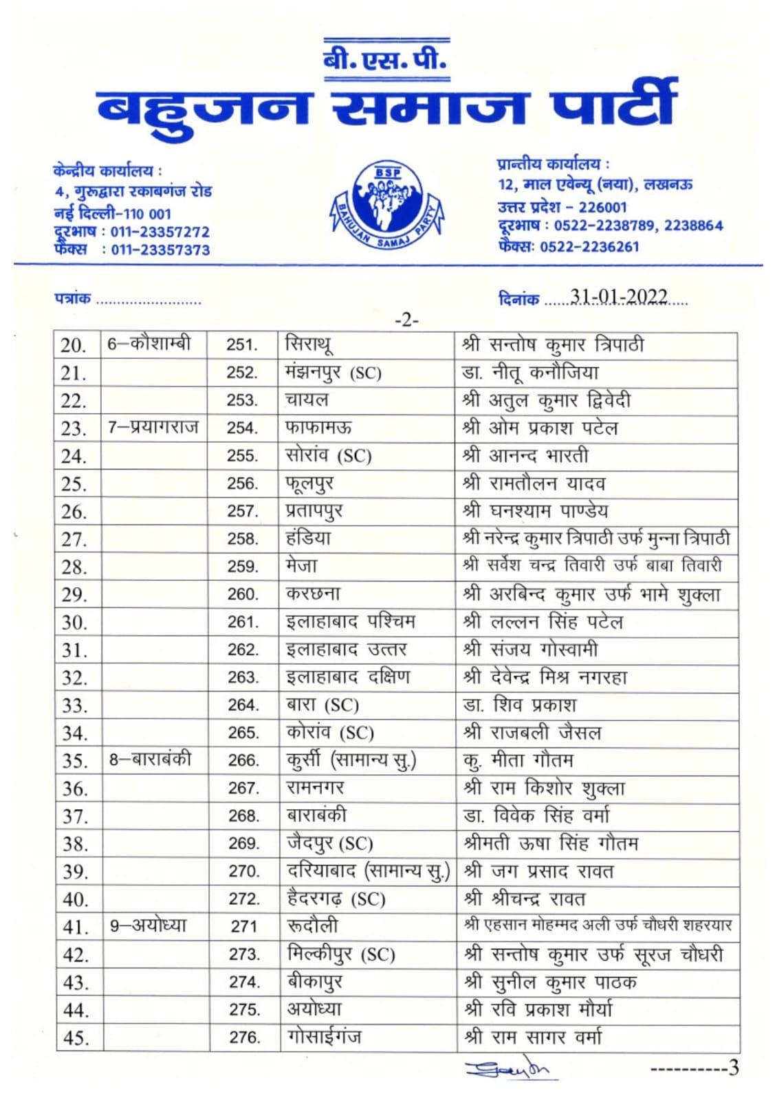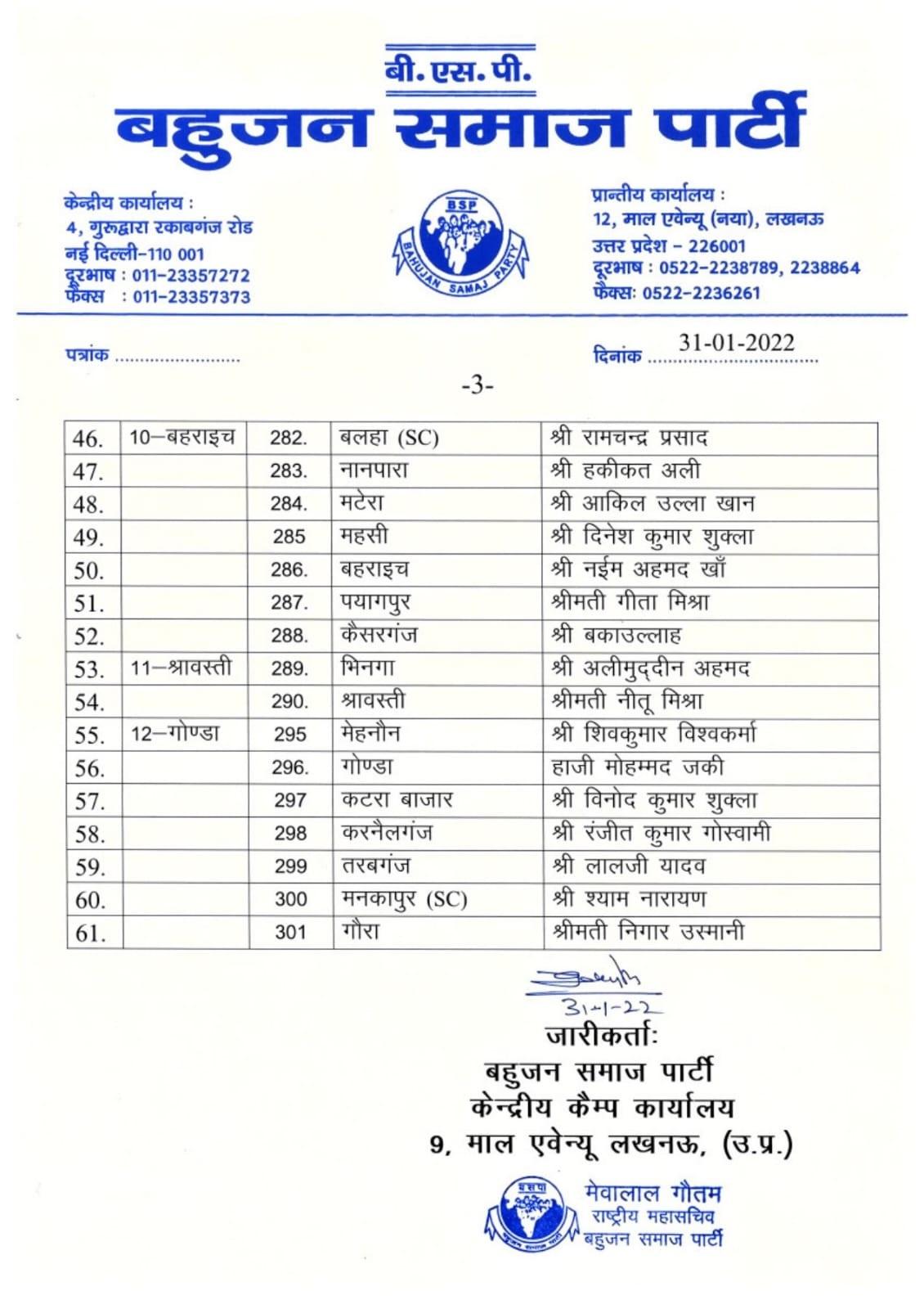 बहुजन समाज पार्टी (BSP) की ओर से उत्तर प्रदेश विधानसभा चुनाव (Uttar Pradesh Assembly Elections 2022) के पांचवें चरण के लिए प्रत्याशियों के एक और सूची जारी की गई. इस लिस्ट में 61 उम्मीदवारों के नाम हैं. उम्मीदवारों की इस लिस्ट में अमेठी, रायबरेली, प्रतापगढ़ सुल्तानपुर, चित्रकूट, कौशांबी, प्रयागराज, बाराबंकी, अयोध्या, बहराइच श्रावस्ती और गोंडा से प्रत्याशियों के नामों का ऐलान हुआ है.