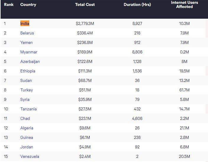 इंटरनेट शटडाउन के मामले में टॉप-5 पर इंडिया, बेलरूस, यमन, म्यांमार और रहे हैं.