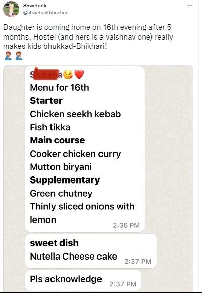 ट्वीट के साथ बेटी के खाने की फरमाइश वाली एक लंबी-चौड़ी लिस्ट भी शेयर की गई है. इसमें स्टार्टर में चिकन कबाब, फिश टिक्का की डिमांड की गई है. मेन कोर्स में चिकन करी, मटन बिरयानी. सप्लीमेंट्री में ग्रीन चटनी, प्याज व नींबू. इसके अलावा मीठे में Nutella Cheesecake की मांग की गई है. आखिर में यह भी लिखा है कि कृपया इस पर ध्यान दिया जाए.