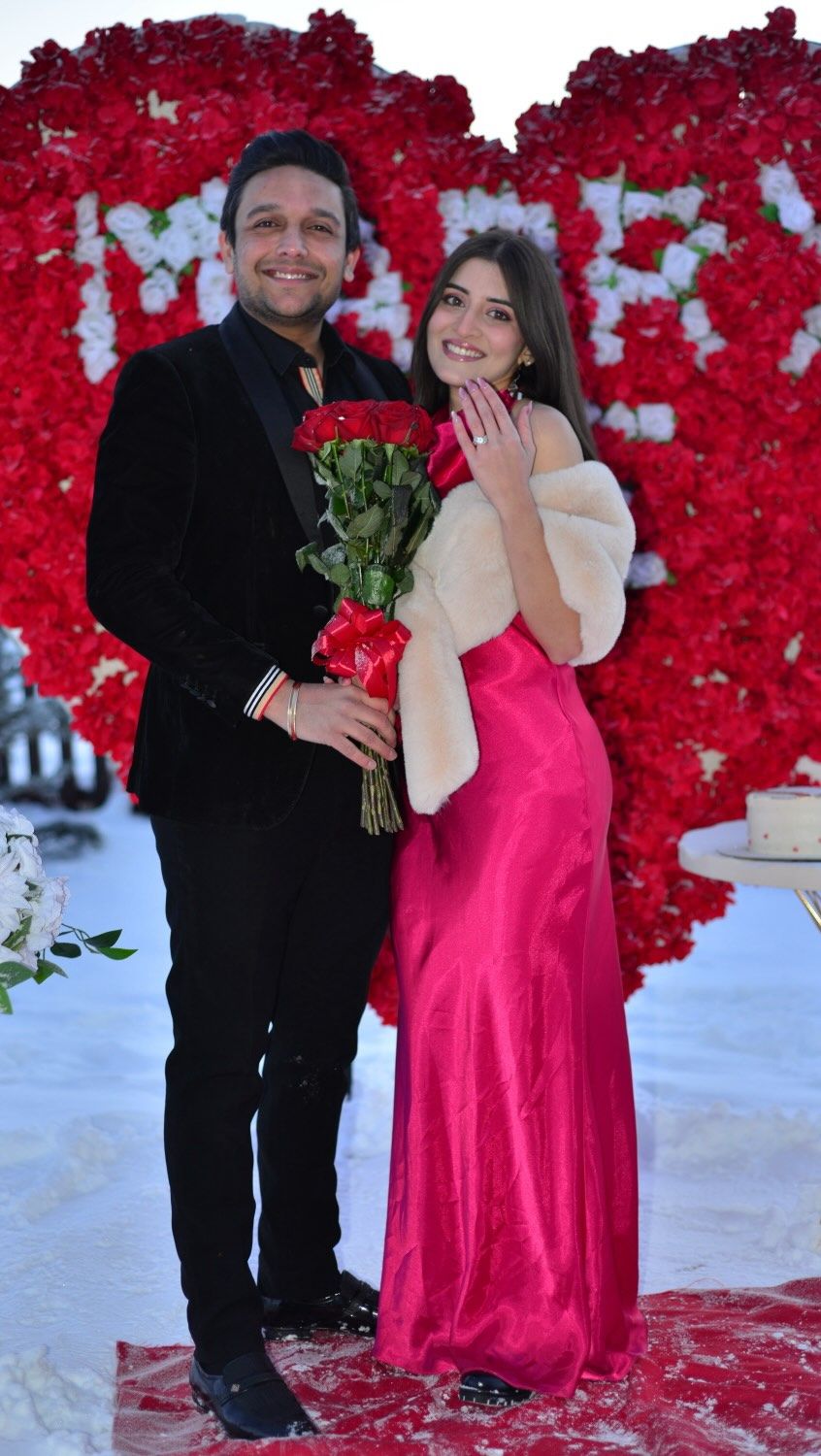 माजेन ने स्नो से ढके माउंटेन एरिया में ड्रीमी प्रपोजल सेटअप किया था. वीडियो में रेड रोज, शैंपेन ग्लास और "नविका, आई लव यू" लिखा केक दिखा.