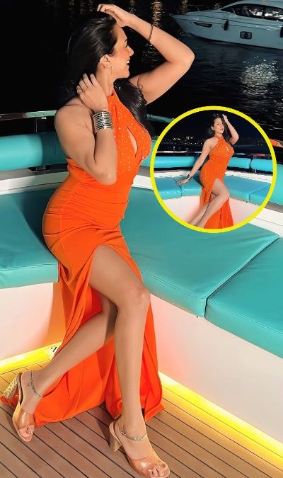 फ्रंट हाई-स्लिट कट ऑरेंज गाउन पहन गौरव की धर्मपत्नी अपना टोन्ड फिगर फ्लॉन्ट करती नजर आ रही हैं.