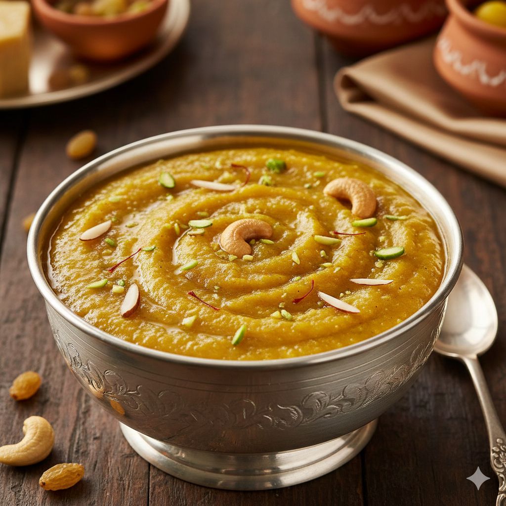 चीनी घुलने के बाद हलवा फिर से घी छोड़ने लगेगा. अंत में ऊपर से कटे हुए मेवे डालें और गरमा-गरम परोसें.