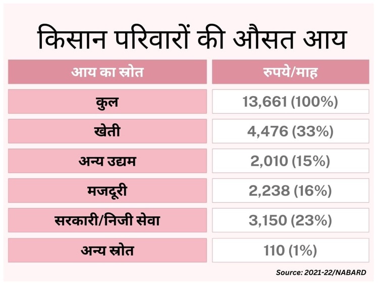 हाल ही में नेशनल बैंक फॉर एग्रीकल्चरल एंड रूरल डेवलपमेंट (NABARD) की एक रिपोर्ट में किसान परिवारों की आय के बारे में चौकाने वाले खुलासे किए गए हैं. इसमें बताया गया है कि 2021-22 में प्रति किसान परिवार सभी स्रोतों से औसत मासिक कमाई सिर्फ 13,661 रुपये है. जिसमें से वो 11,710 रुपये खर्च कर देता है. यानी किसान परिवार महीने में सिर्फ 1951 रुपये बचत कर पाता है. अगर रोजाना की बात करें तो यह सिर्फ 65 रुपये होगा.
