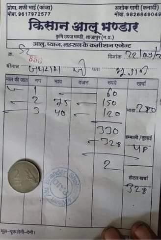 शाजापुर की कृषि उपज मंडी में जयराम नाम का एक किसान छह बोरी (300 किलो) प्याज लेकर आया. एक बोरी का दाम 60 रुपये मिला. दो अन्य बोरी का भाव 75 रुपये प्रति बोरी के मान से 150 रुपये मिला. बाकी तीन बोरियों का भाव 40 रुपये प्रति बोरी के मान से 120 रुपये मिले. इस तरह किसान को प्याज बेचने के बाद कुल 330 रुपये का बिल बना, जिसमें से 280 रुपये ट्रांसपोर्ट के कट गए और 48 रुपये हम्माली व तुलाई का खर्च आया. कुल मिलाकर 328 रुपये खर्च काटने के बाद किसान के हाथ में सिर्फ दो रुपये आए.