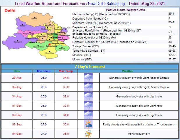 राष्ट्रीय राजधानी दिल्ली के मौसम में उमस भरी गर्मी से मामूली राहत मिलती दिखाई दे रही है. मौसम विभाग (IMD) ने आज (रविवार) यानी 29 अगस्त को आंशिक रूप से बादल छाए रहने के साथ ही हल्की बारिश या बूंदाबांदी का अनुमान जताया है. दिल्ली में न्यूनतम तापमान 26 डिग्री सेल्सियस और अधिकतम तापमान 34 डिग्री सेल्सियस बना रह सकता है.