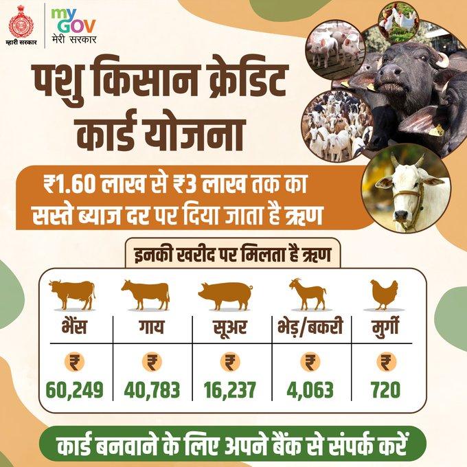 बता दें कि पशु किसान क्रेडिट कार्ड के जरिए गाय खरीदने पर 40,783 रुपये, भैंस खरीदने पर 60,249 रुपये, सूअर खरीदने पर 16,237 रुपये, भेड़/बकरी खरीदने पर 4,063 रुपये और मुर्गी खरीदने के लिए 720 प्रति यूनिट का लोन मिल जाता है.