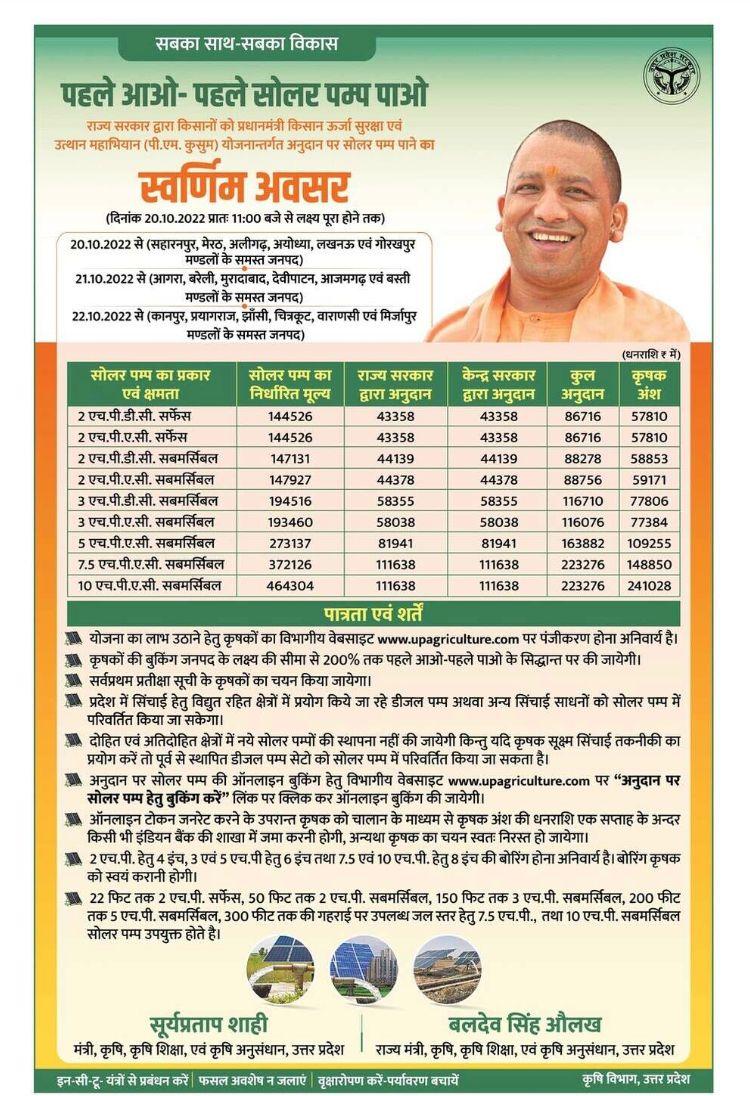 उत्तर प्रदेश सरकार ने कुछ वक्त पहले किसानों को पीएम कुसुम योजना के तहत बंपर सब्सिडी पर सोलर पंप देने की घोषणा की थी. अब इसपर नया अपडेट सामने आया है. दरअसल सरकार ने 20 अक्टूबर 2022 को सहारनपुर, मेरठ, अलीगढ़, अयोध्या, लखनऊ और गोरखपुर मंडल के सभी जिलो में सोलर पंप वितरित करने का फैसला किया है. इसी प्रकार 21 अक्टूबर को आगरा, बरेली, मुरादाबाद, देवीपाटन, आजमगढ़ और बस्ती मंडल के सभी जिलों में ये पंप दिए जाएंगे. इसके अलावा 22 अक्टूबर को कानपुर प्रयागराज, झांसी, चित्रकुट, मिर्जापुर, वाराणसी मंडल के सभी जिलों में सोलर पंप की खरीद पहले आओ और पहले पाओ के आधार पर की जा सकती है.