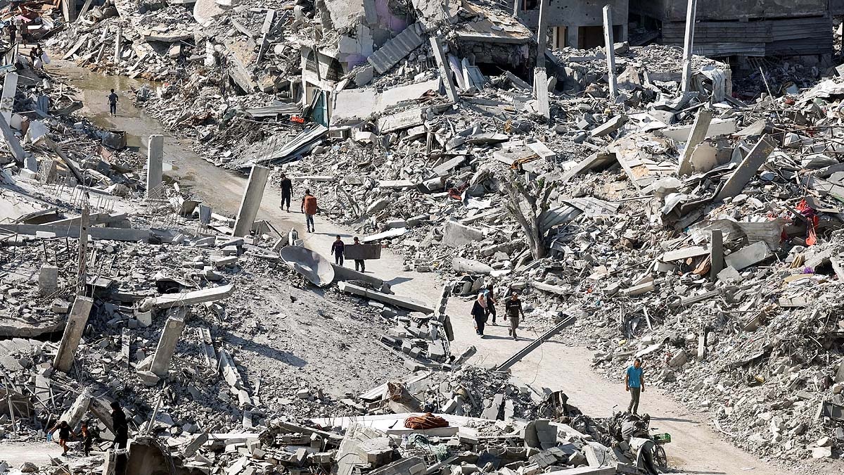 उत्तरी गाजा में कुछ इमारतें अभी भी खड़ी हैं, लेकिन वे जमीन से बाहर निकली हड्डियों जैसी लगती हैं. इनके आसपास जो कभी घनी आबादी वाला इलाका था, वह अब मलबे और धूल में दबा हुआ है. इमारतें उड़ाई गईं, तोड़ी गईं या कुचल दी गईं. Photo: Reuters