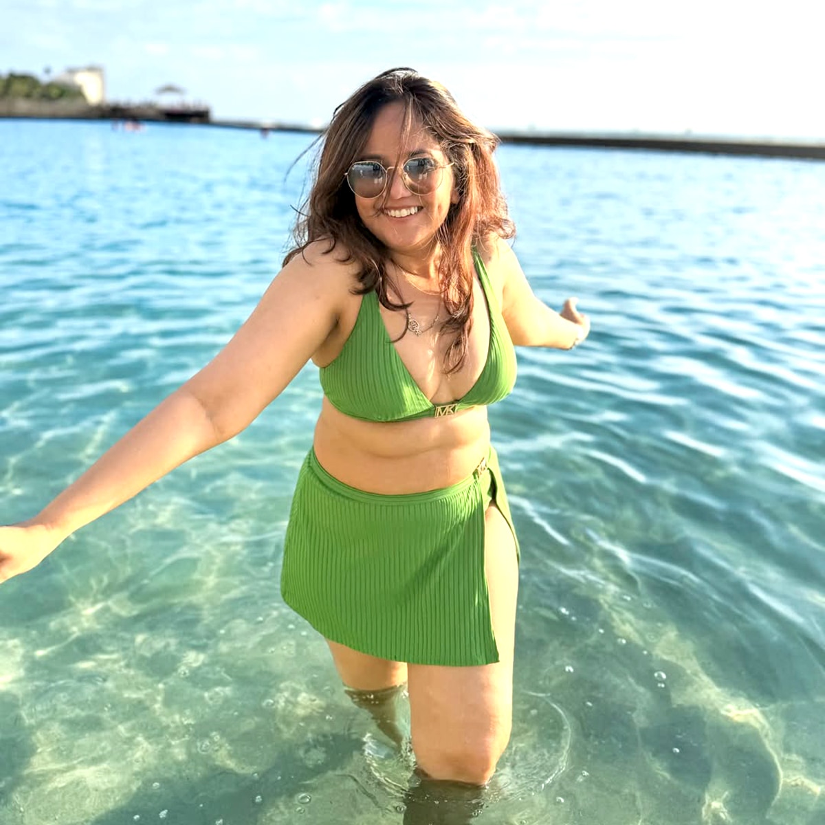 रूपल हनीमून पर ग्रीन कलर की बिकिनी में नजर आ रही हैं. उन्होंने बिकिनी बॉटम के साथ मैचिंग शॉर्ट स्कर्ट भी कैरी किया है. बिकिनी में वो सुपर स्टनिंग लगीं.