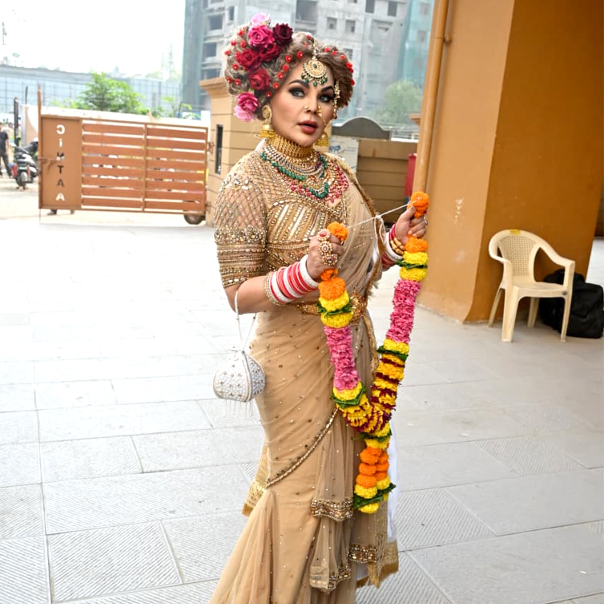 शुक्रवार को राखी सावंत ने दुल्हन के जोड़े में सरप्राइज एंट्री ली. उन्होंने गोल्डन कलर की साड़ी पहनी थी. गोल्डन साड़ी पर राखी ने यूनिक हेयरस्टाइल बनाया था, जिसे उन्होंने ढेर सारे रेड रोज से सजाया था.