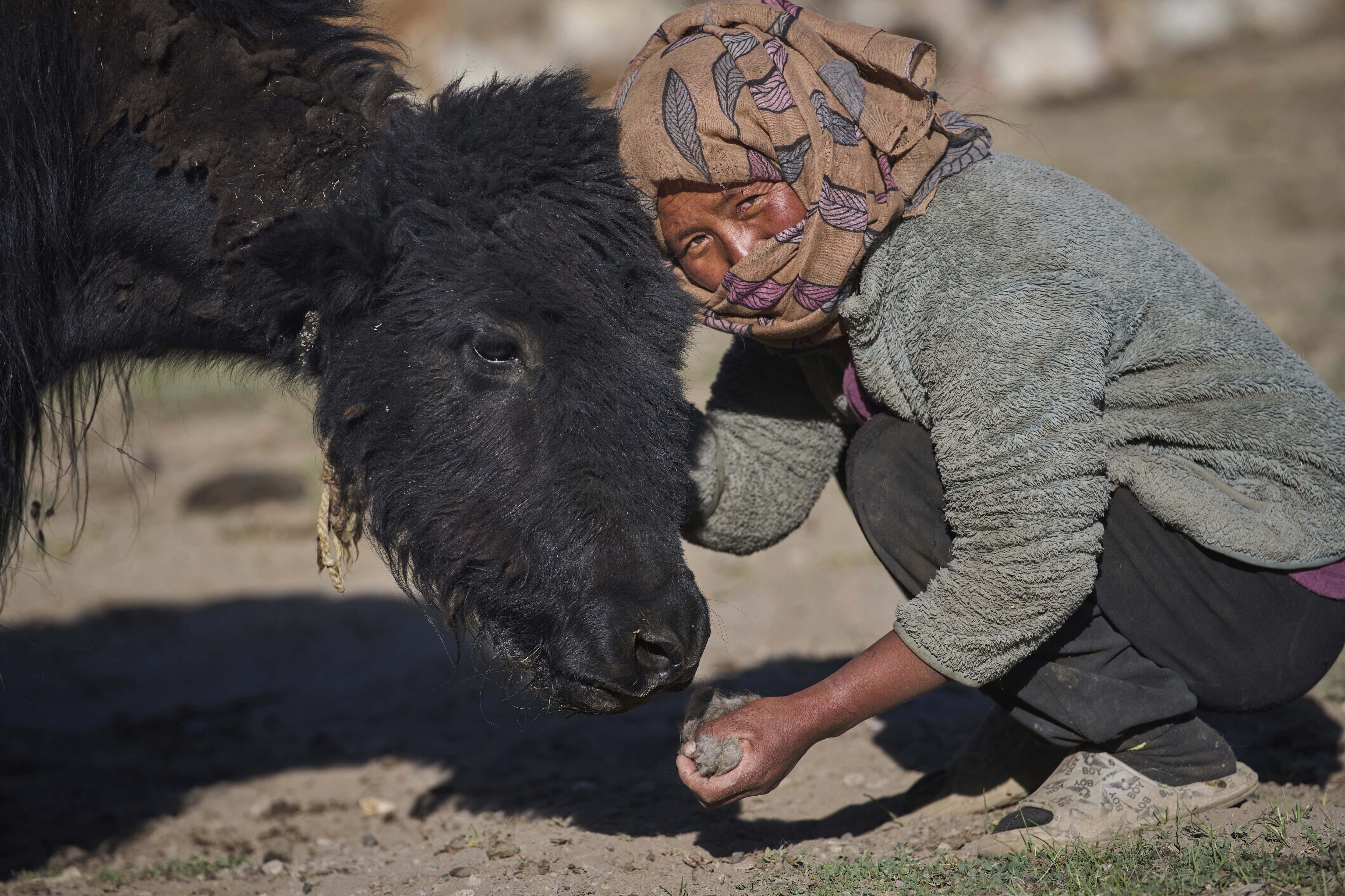 लद्दाख के कोरजाक गांव में याक की खाल और बालों को सुखाने के लिए ले जाती त्सेरिंग डोल्मा. सदियों ये याक चरवाहे पहाड़ों से पिघलकर आने वाली बर्फ पर ही निर्भर रहे हैं. PHOTO: AP