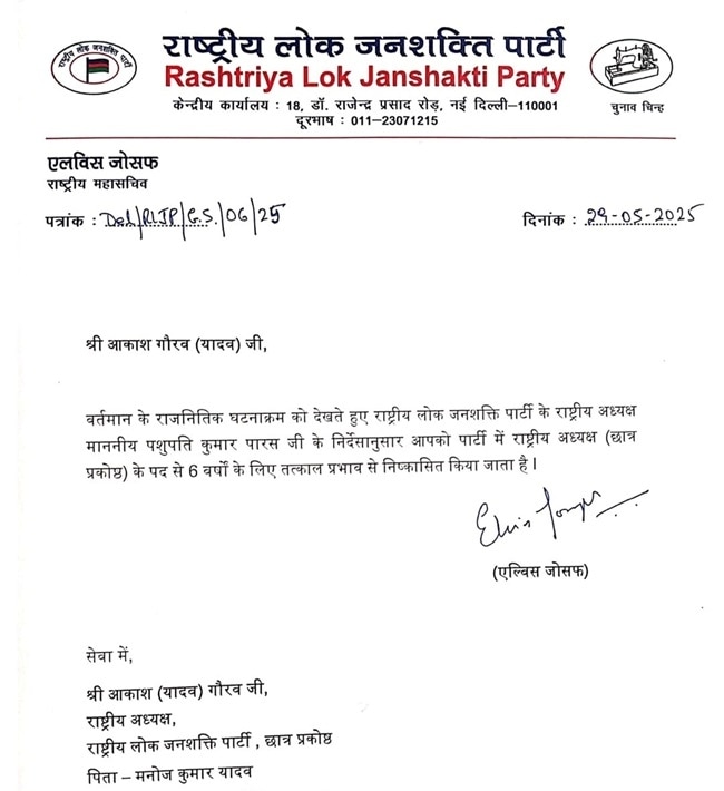 पशुपति पारस ने अनुष्का यादव के भाई आकाश यादव को पार्टी से निकाल दिया है. आकाश यादव के निष्कासन से संबंधित पत्र आरएलजेपी के राष्ट्रीय महासचिव एलविस जोसफ के हस्ताक्षर से जारी किया गया है. एलविस की ओर से जारी आकाश यादव को संबोधित पत्र में कहा गया है कि वर्तमान के राजनीतिक घटनाक्रम को देखते हुए राष्ट्रीय अध्यक्ष पशुपति कुमार पारस के निर्देश पर आपको पार्टी से तत्काल प्रभाव से छह साल के लिए निष्कासित किया जाता है.