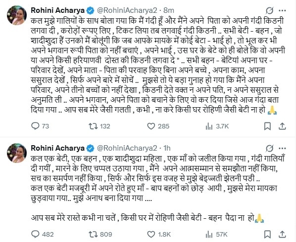 उन्होंने आगे कहा कि जिस परिवार में भाई होते हैं, वहां त्याग की जिम्मेदारी उन्हीं की होती है, इसलिए उन्होंने अपने भाई से नाता तोड़ दिया है. रोहिणी ने कहा कि उनके माता-पिता और बहनें उनके साथ हैं. उन्होंने बताया कि वह अब मुंबई अपने ससुराल जा रही हैं, क्योंकि उनके ससुराल वाले उनकी चिंता कर रहे हैं और उन्हें वापस बुलाया है.
