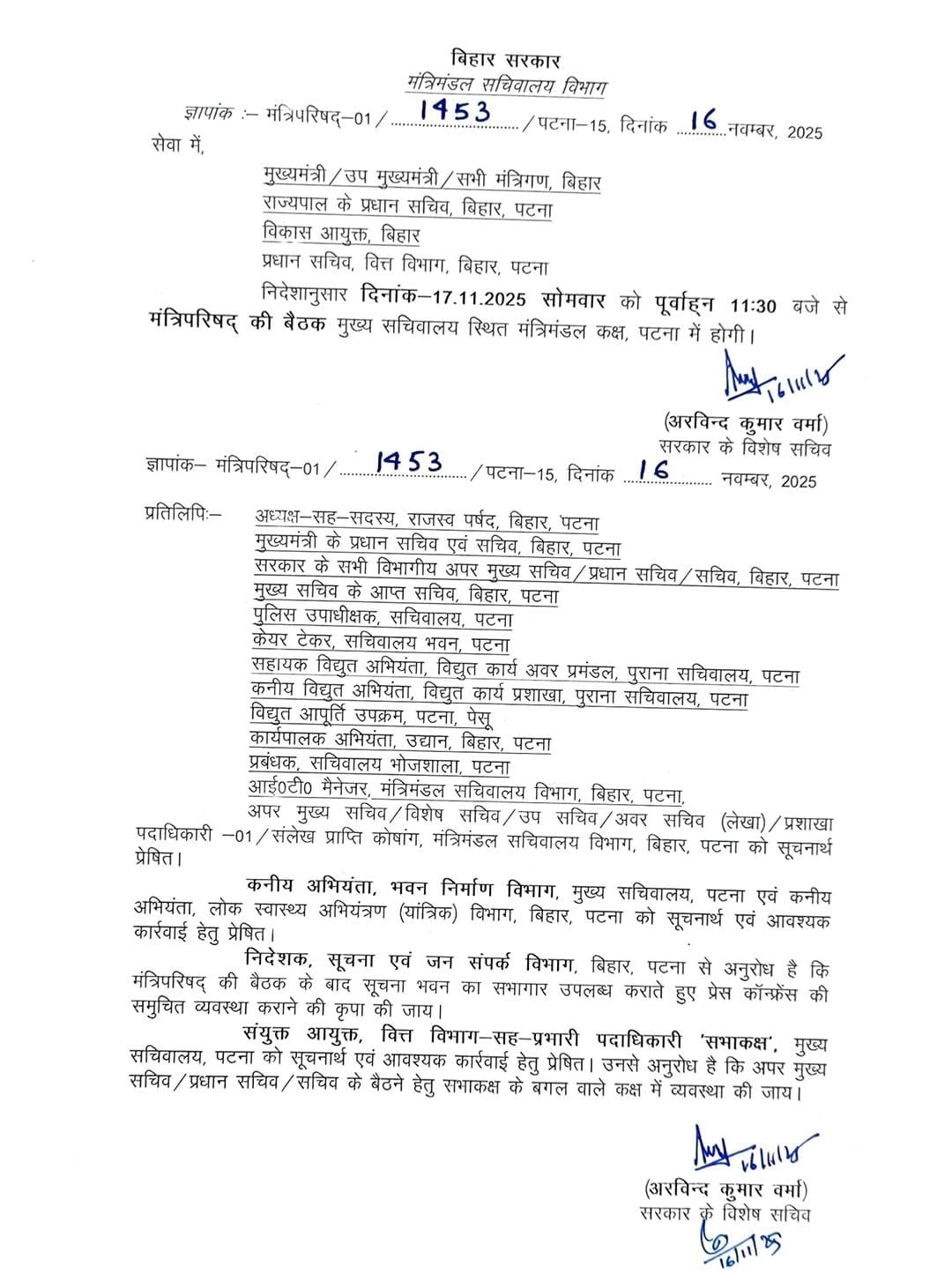 बिहार के मुख्यमंत्री नीतीश कुमार ने कल सुबह 11:30 बजे कैबिनेट की अहम बैठक बुलाई है. इस बैठक में मौजूदा मंत्रिमंडल को भंग करने के फैसले पर औपचारिक मंजूरी दी जाएगी. कैबिनेट की बैठक खत्म होते ही नीतीश कुमार सीधे राजभवन पहुंचेंगे, जहां वे राज्यपाल को अपना इस्तीफा सौंपेंगे. नीतीश के इस्तीफा देने के बाद बिहार में नई सरकार के गठन की प्रक्रिया शुरू हो जाएगी. पूरी खबर को आप यहां क्लिक कर पढ़ सकते हैं - बिहार में शपथ ग्रहण की तैयारी तेज...