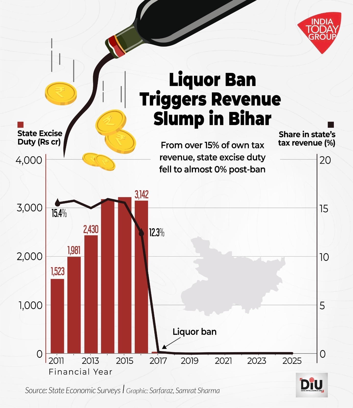 शराब पर राज्य को मिलने वाली एक्साइज ड्यूटी बिहार सरकार की आय का बड़ा हिस्सा थी. लेकिन शराबबंदी लागू होने के बाद राज्य को अपने सकल राज्य घरेलू उत्पाद (GSDP) का लगभग 1 प्रतिशत नुकसान झेलना पड़ा. जो उसके कुल टैक्स रेवेन्यू के 15 प्रतिशत के बराबर था.