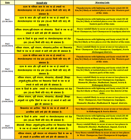 24 जून को पश्चिम चंपारण, पूर्वी चंपारण, गोपालगंज, सीतामढ़ी, शिवहर, मधुबनी और सुपौल जिलों के एक या दो स्थानों में भारी बारिश की संभावना है. वहीं, किशनगंज और अररिया जिले में एक या दो स्थानों पर अत्याधिक भारी बारिश का अलर्ट है. 25 जून की बात करें तो अधिकतर इलाकों में 30-40 किमी की रफ्तार से हवाएं चलेंगी और सीतामढ़ी, शिवहर, मधुबनी, सुपौल, अररिया और किशनगंज में एक या दो स्थानों में भारी बारिश की संभावना है. वहीं, पश्चिम चंपारण, पूर्वी चंपारण और गोपालगंज जिले के एक या दो स्थानों में अत्याधिक भारी बारिश का अलर्ट है.