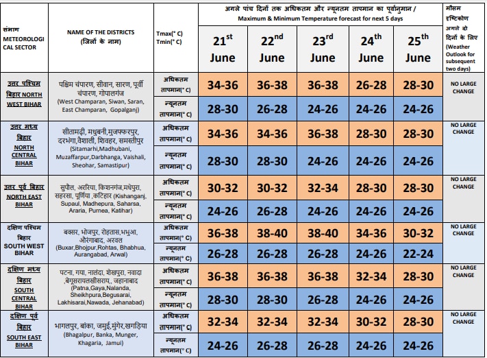 दक्षिण पश्चिम बिहार के बक्सर, भोजपुर, रोहतास, भभुआ, औरंगाबाद, अरवल में अधिकतम तापमान 38 से 40 डिग्री सेल्सियस और न्यूनतम तापमान 26 से 28 डिग्री सेल्सियस रहने की उम्मीद है. दक्षिण मध्य बिहार के पटना, गया, नालंदा, शेखपुरा, नवादा, बेगूसराय, लखीसराय, जहानाबाद में अधिकतम तापमान 36 से 38 डिग्री सेल्सियस और न्यूनतम टेंपरेचर 28 से 30 डिग्री सेल्सियस दर्ज की जाएगी.दक्षिण पूर्ण बिहार के भागलपुर, बांका, जमुई, मुंगेर, खगड़िया में अधिकतम तापमान 32 से 34 डिग्री सेल्सियस और न्यूनतम तापमान 26 से 28 डिग्री सेल्सियस रहने की संभावना है.