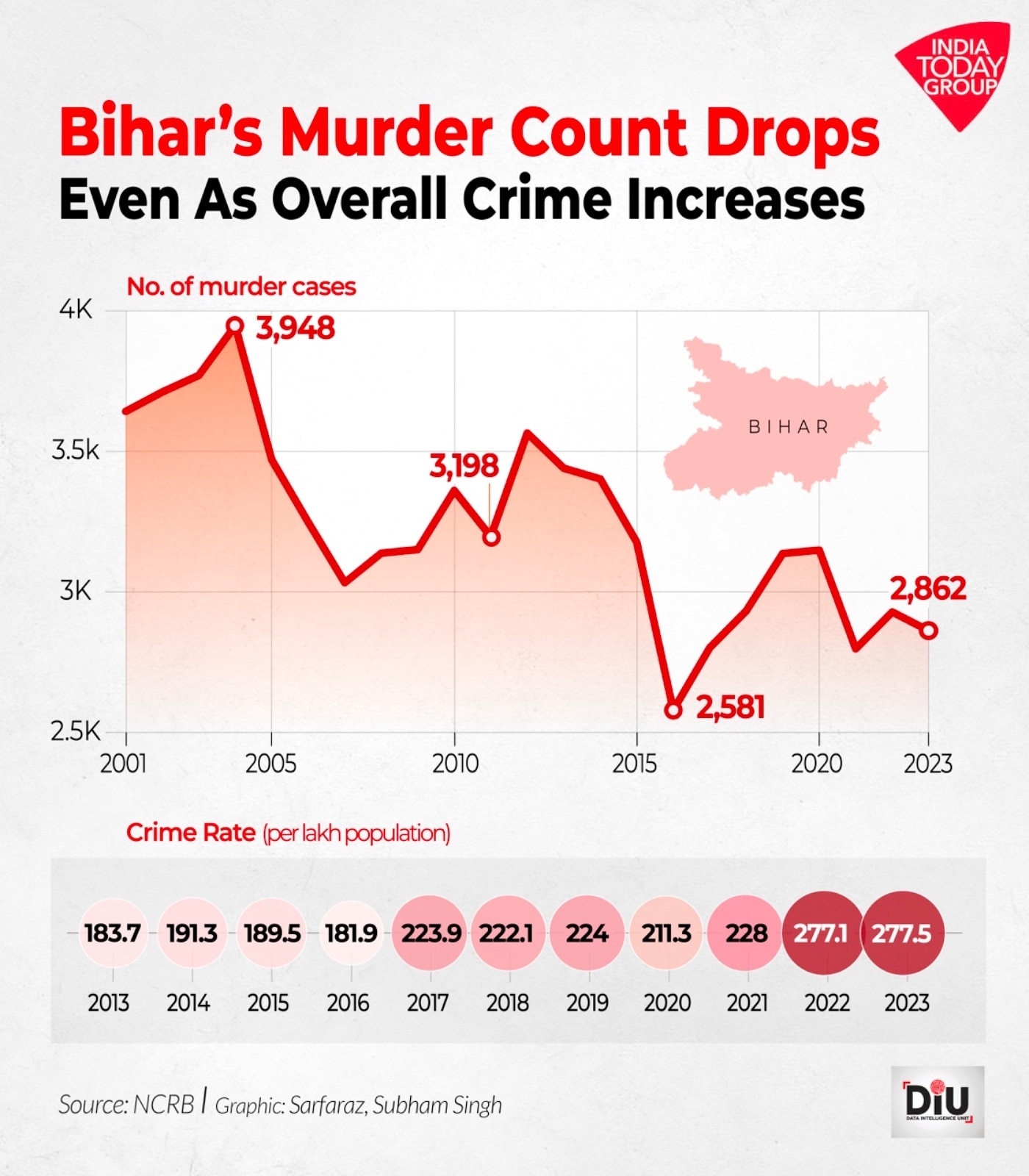 साल 2001 में बिहार में कुल 3,643 हत्याएं दर्ज की गईं. दो साल बाद यह संख्या बढ़कर 3,771 हो गई. हालांकि, मध्य 2000 के दशक में ये घटकर 2007 तक 3,034 हो गई.