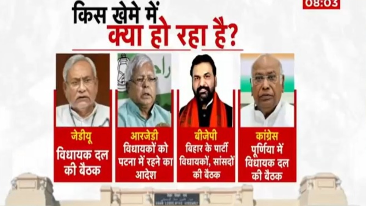 बिहार में जारी सियासी उठापटक के बीच विभिन्न राजनीतिक दलों की बैठकों का दौर भी जारी है. पटना में जहां जेडीयू विधायक दल की बैठक होगी तो वहीं आरजेडी ने विधायकों को पटना में रहने का आदेश दिया. बीजेपी आज अपने सांसदों और विधायकों संग बैठक करेगी, तो दूसरी तरफ पूर्णिया में कांग्रेस विधायक दल की बैठक होगी जिसके लिए भूपेश बघेल को पर्यवेक्षक बनाकर भेजा गया है.
