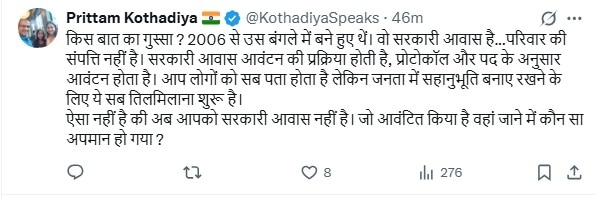 इस पोस्ट के बाद रोहिणी सोशल मीडिया पर लोगों के निशाने पर आ गई हैं. कई यूजर्स उनकी पोस्ट की आलोचना करते हुए उनसे सवाल कर रहे हैं. एक यूजर्स ने कहा कि किस बात का गुस्सा है? 2006 से उस बंगले में बने हुए थें. वो सरकारी आवास है...परिवार की संपत्ति नहीं है. सरकारी आवास आवंटन की प्रक्रिया होती है, प्रोटोकॉल और पद के अनुसार आवंटन होता है. आप लोगों को सब पता होता है, लेकिन जनता में सहानुभूति बनाए रखने के लिए ये सब है. ऐसा नहीं है कि अब उनके पास सरकारी आवास नहीं है. जो आवंटित किया है वहां जाने में कौन-सा अपमान हो गया?.