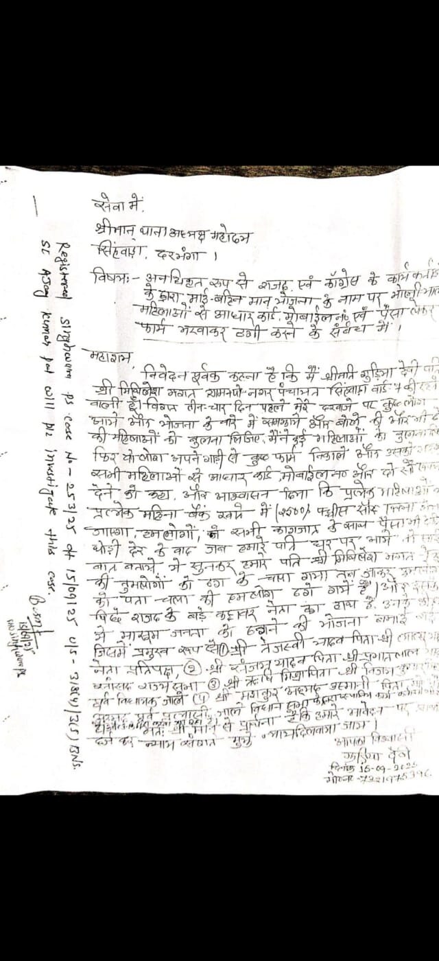 गुड़िया देवी का आरोप है कि यह योजना नेताओं के नाम पर चलाई जा रही थी और भोली-भाली महिलाओं को गुमराह कर उनसे पैसे लिए जा रहे हैं. महिला ने इस मामले में सिंहवाड़ा थाना में लिखित शिकायत दी थी.