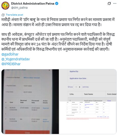 इस बारे में पटना जिला प्रशासन ने एक्स पर लिखा, 'मसौढ़ी अंचल में ‘डॉग बाबू' के नाम से निवास प्रमाण पत्र निर्गत करने का मामला प्रकाश में आया है. मामला संज्ञान में आते ही उक्त निवास प्रमाण पत्र रद्द कर दिया गया है.