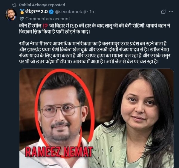 लेकिन रोहिणी ने अपने एक्स हैंडल से एक पोस्ट को री-पोस्ट किया, जिसने रमीज के बारे में कुछ जानकारी साझा करते हुए चौंकाने वाले दावे किए हैं. इस पोस्ट में दावा किया गया है कि रोहिणी जिस रमीज का जिक्र कर रही हैं, वह कोई साधारण शख्स नहीं, बल्कि रमीज नेमत नाम का एक ऐसा व्यक्ति है जिसकी पृष्ठभूमि बेहद विवादास्पद बताई जाती है.