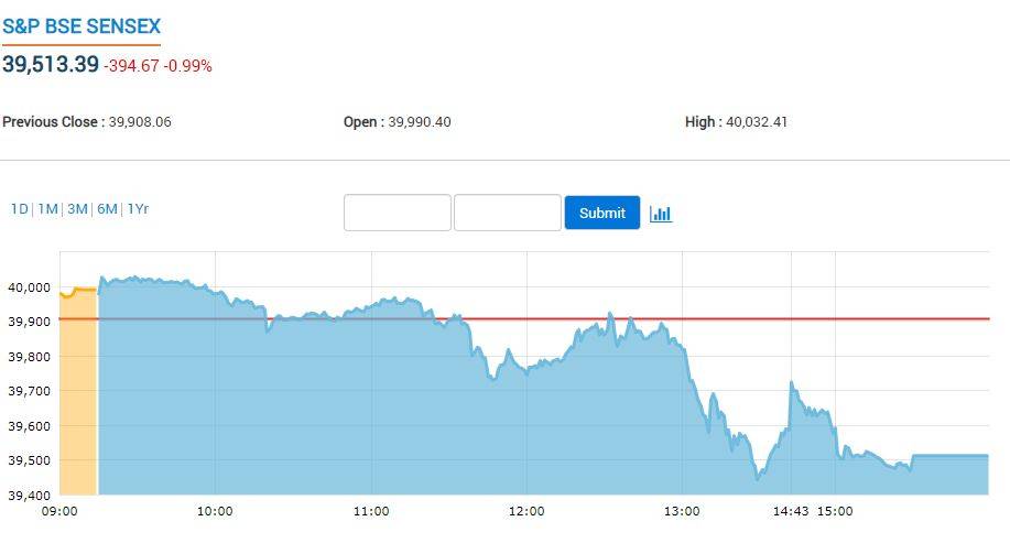 भारतीय शेयर बाजार को मोदी सरकार के दूसरे कार्यकाल का पहला बजट नहीं पसंद आया है. शेयर बाजार की 40 हजार के स्तर पर शुरुआत हुई लेकिन बजट के बाद बाजार ने बढ़त गंवा दी और कारोबार के अंत में दिन के निचले स्तरों पर बंद हुआ. सेंसेक्स 394.67 अंक की गिरावट के साथ 39513.39 के स्तर पर रहा. वहीं निफ्टी 135.60 अंक की कमजोरी के साथ 11,811.15 के स्तर पर बंद हुआ.