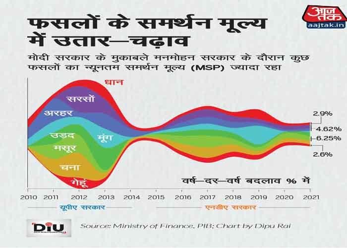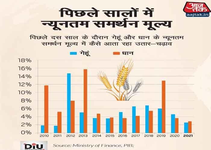 आंकड़ों से पता चलता है कि पिछले 10 वर्षों में रबी और खरीफ की लगभग सभी फसलों के लिए एमएसपी में औसतन गिरावट ही आई है. सरकार की ताजा घोषणा में गेहूं और धान की एमएसपी में क्रमशः 2.6 फीसदी और 2.9 फीसदी की वृद्धि हुई है जो कि पिछले एक दशक में सबसे कम है.