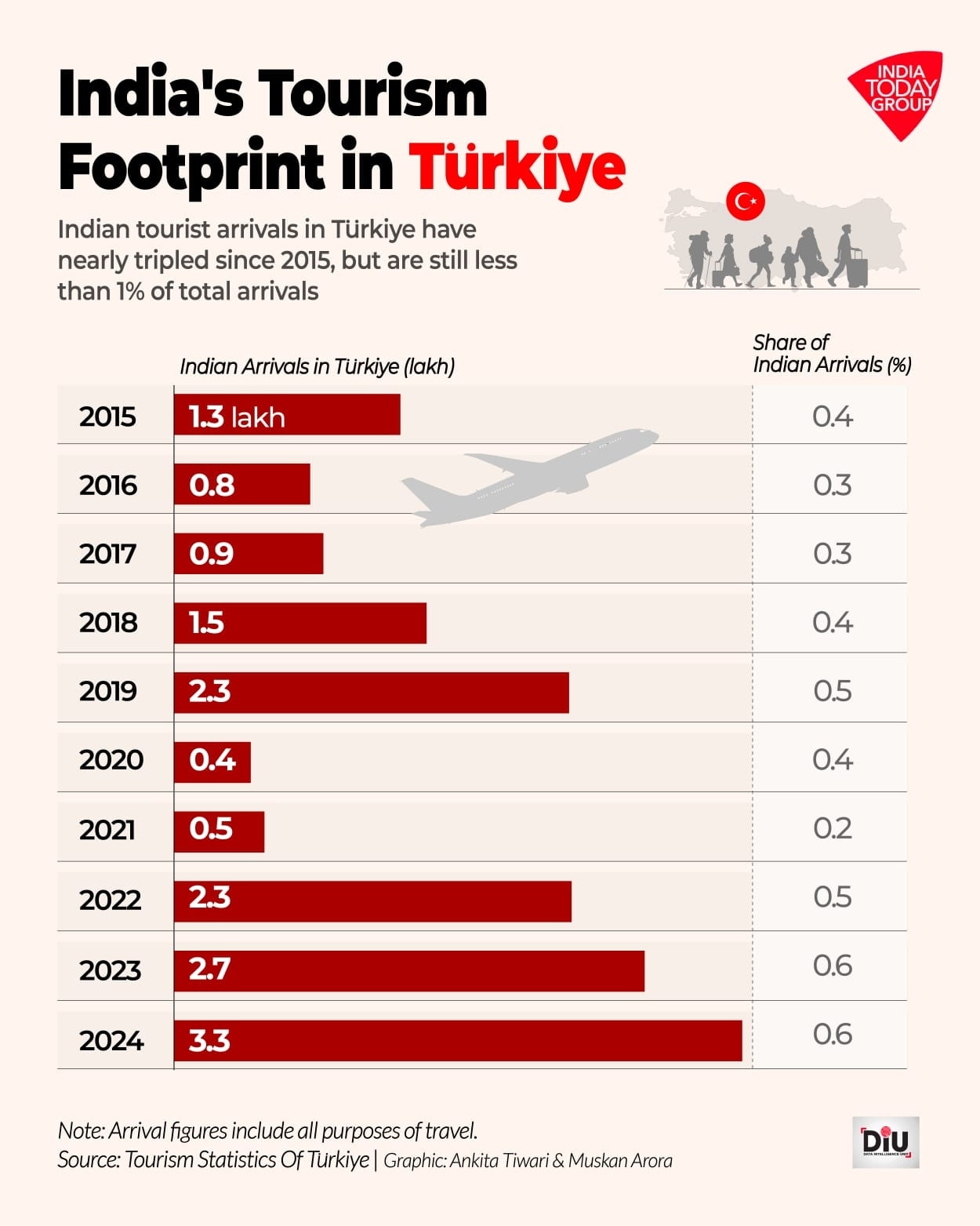साल 2019 तक, तुर्किए में विदेशी पर्यटकों की संख्या बढ़कर 4.51 करोड़ हो गई, जिसमें भारत से केवल 2.3 लाख यानी 0.5% पर्यटक थे. 2023 में, कुल पर्यटक आगमन 4.92 करोड़ तक पहुंचा, जबकि भारतीय पर्यटक 2.7 लाख थे, जो 0.6% थे. साल 2024 में दुनियाभर से कुल 5.26 करोड़ विदेशी पर्यटक तुर्किए पहुंचे, जिसमें भारत से केवल 3.3 लाख पर्यटक थे, जो महज 0.6% होता है.