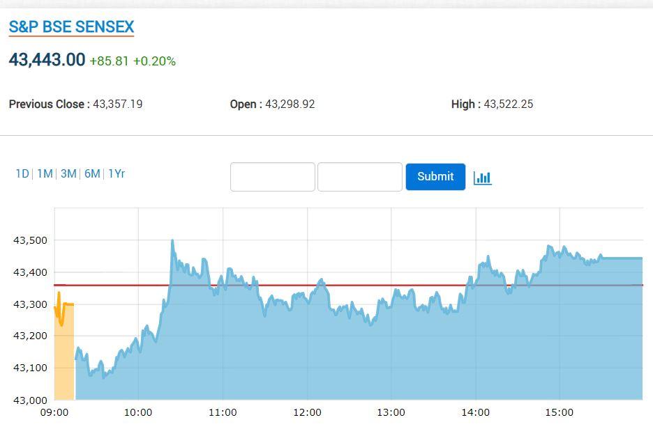 शेयर बाजार में शुक्रवार को जबरदस्त उतार-चढ़ाव रहा. करीब 300 अंकों की गिरावट के बाद कारोबर के अंत में सेंसेक्स करीब 86 अंक मजबूत हुआ और 43,443 अंक के स्तर पर ठहरा. निफ्टी की बात करें तो करीब 30 अंक मजबूत होकर 12,720 अंक के स्तर पर पहुंच गया.