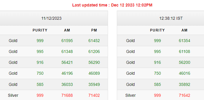 Sona-Chandi Ke Bhav: भारतीय सर्राफा बाजार में आज, 12 दिसंबर 2023 की सुबह सोने की कीमतों में गिरावट और चांदी के रेट में उछाल देखने को मिला है. सोना 61 हजार रुपये प्रति 10 ग्राम के पार है तो वहीं, चांदी का भाव 71 हजार रुपये प्रति किलो से अधिक है. राष्ट्रीय स्तर पर 999 शुद्धता वाले 24 कैरेट वाले 10 ग्राम सोने की कीमत 61354 रुपये है. जबकि 999 शुद्धता वाली चांदी (Silver) की कीमत 71642 रुपये है.