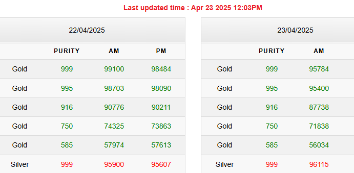 इंडिया बुलियन एंड ज्वैलर्स एसोसिएशन (India Bullion And Jewellers Association) के मुताबिक, मंगलवार, 22 अप्रैल की शाम को 916 शुद्धता यानी 22 कैरेट गोल्ड का रेट (Gold Rate) 90211 रुपये प्रति 10 ग्राम था जो आज, 23 अप्रैल की सुबह गिरावट के साथ 87738 रुपये तक आ गया है. इसी तरह शुद्धता के आधार पर सोना सस्ता हुआ है. जबकि चांदी की कीमत में उछाल आया है.