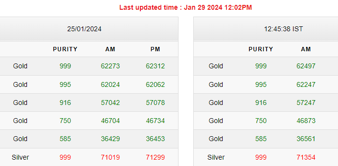 इंडिया बुलियन एंड ज्वैलर्स एसोसिएशन (India Bullion And Jewellers Association) के मुताबिक, गुरुवार की शाम को 24 कैरेट का शुद्ध सोना 62312 रुपये प्रति 10 ग्राम था, जो आज (सोमवार) सुबह महंगा होकर 62497 रुपये पर आ गया है. इसी तरह शुद्धता के आधार पर सोना और चांदी महंगा हुआ है.